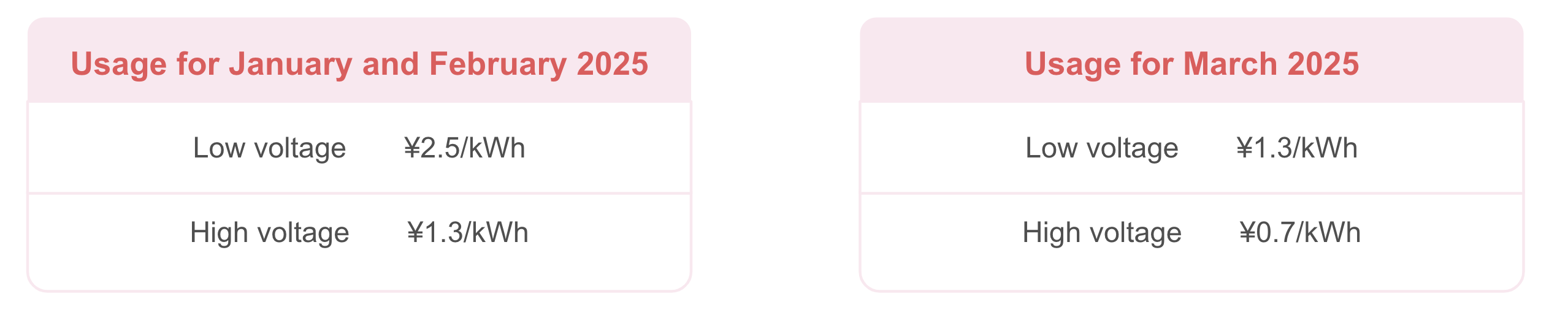 Based on the support unit price determined under the “Electricity and Gas Price Reduction Support Program”, we will apply a discount to electricity charges from the February 2025 meter reading (for January usage) to the April 2025 meter reading (for March usage).